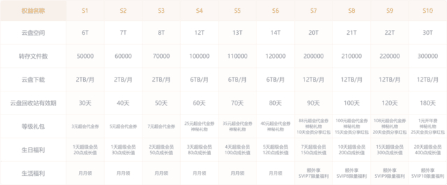 以超级会员为例,升至SVIP10即可享云盘空间高至30T,回收站文件保存期限180天,文件转存单次达30万次等,权益较旧版本大幅提升。