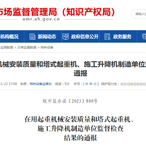 中国质量新闻网讯 2023年11月22日,安徽省市场监督管理局网站通报在用起重机械安装质量和塔式起重机、施工升降机制造单位监督检查结果。