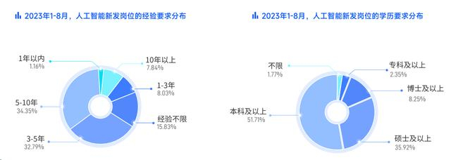 人工智能人才入行门槛高,培养周期长,一定程度上加剧了人才争夺战。2023年1-8月,新发布的人工智能岗位中,有42.19%的岗位要求具有5年以上的经验。而高达95.88%的岗位要求应聘者拥有本科及以上学历,其中,要求硕士或博士及以上学历的岗位占比达到了44.17%。