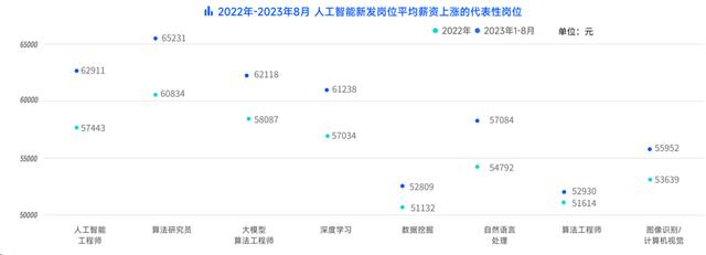 受供需关系影响,多个AI岗位薪资水涨船高。人工智能工程师、算法研究员、大模型算法工程师等多个核心技术岗位的平均薪资涨幅明显,其中人工智能工程师新发岗位平均薪资从2022年的57433元上涨至2023年8月的62911元,增长5468元,涨幅9.5%,成为人工智能行业平均薪资涨幅最高的工种。其次是算法研究员(上涨4397元)和深度学习(上涨4204元)。2023年1-8月,新发岗位的月薪TOP3分别是ChatGPT研究员、算法研究员和人工智能工程师。其中,ChatGPT研究员以平均月薪66244元位列第一。