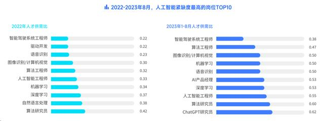 在人工智能的热招岗位中,算法岗需求旺盛。其中,算法工程师新发岗位量遥遥领先,占比达到46.45%,自然语言处理新发岗位量占比达到11.04%,位列热招岗位第2,算法研究员(5.36%)位居第5。随着人工智能技术在智能驾驶、机器人制造等领域的应用,图像识别/计算机视觉(6.68%)、智能驾驶系统工程师(5.27%)岗位也在热招。与此同时,多个AI岗位的人才紧缺度也持续上升。2023年1-8月紧缺度最高的10个岗位中,智能驾驶系统工程师凭借0.38的人才供需比位居首位。ChatGPT研究员也跻身进入紧缺度TOP10岗位。