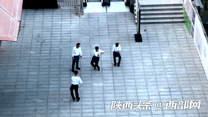 在曲江创意谷,4名服务员正在练习“科目三”双腿摇摆的动作。
