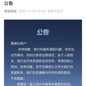 “电视家”这类的直播App为何会暂停服务?充值的会员费还能退吗?11月23日,封面新闻记者拨打该公司电话,了解退费相关消息。该公司工作人员告诉封面新闻记者,今年的订单目前已经退到六七月份了,预计在这两三天之内会陆续退完。
