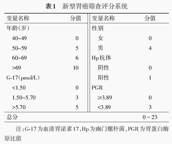在胃癌风险人群中,年龄、性别、血清Hp抗体、胃蛋白酶原比值和血清胃泌素17是与胃癌发生最相关的5个因素,被赋予了不同的分值,总分0~23分。根据分值可将胃癌筛查目标人群分为3个等级:胃癌高危人群(17~23分),说明胃癌发生风险极高;胃癌中危人群(12~16分),有一定胃癌发生风险;胃癌低危人群(0~11分),胃癌发生风险一般。