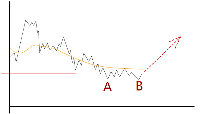 条件3:分时线逐渐走平,较平缓的A点形成,静等B点,如不破A点,分时线刚一抬头马上买入