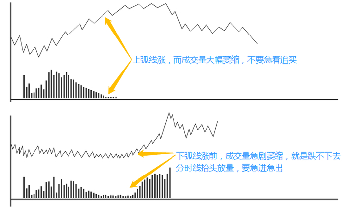 条件2:下弧线涨,成交量萎缩时要小心涨
