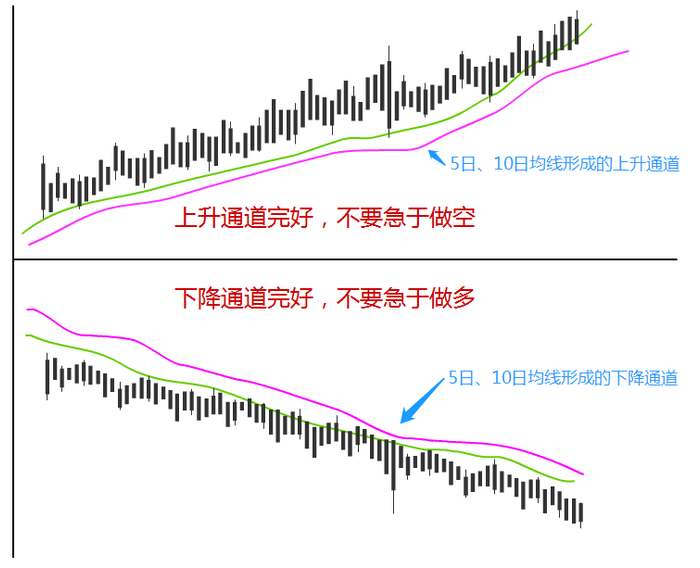 条件1:在3、5分钟图上,5、10均线所形成的通道完好