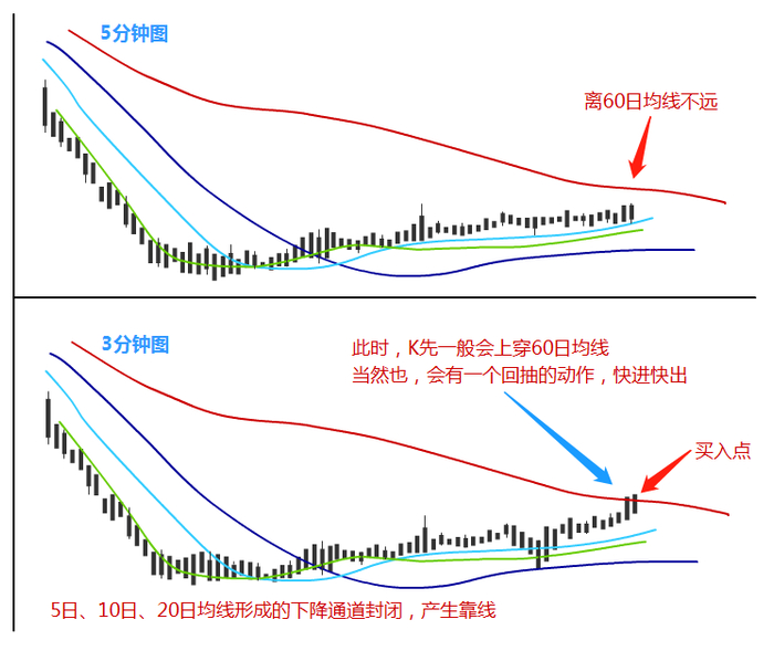 条件1:在3分钟图上,下降通道已封闭,5、10、20均线已走平粘合,正在靠近红色的60均线