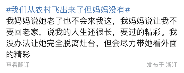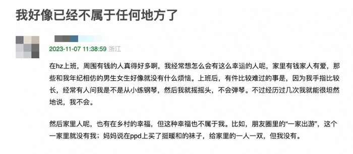 “消费完就觉得自己配不上这些,这只是我的一层包装纸,内核依旧是那个用‘元’当计量单位,每笔消费都要反复叨念的妈妈。但我每年回家的时候,现实却又清楚告诉我,那里我已经回不去了。无论在城市还是乡村,我都是异乡人。”