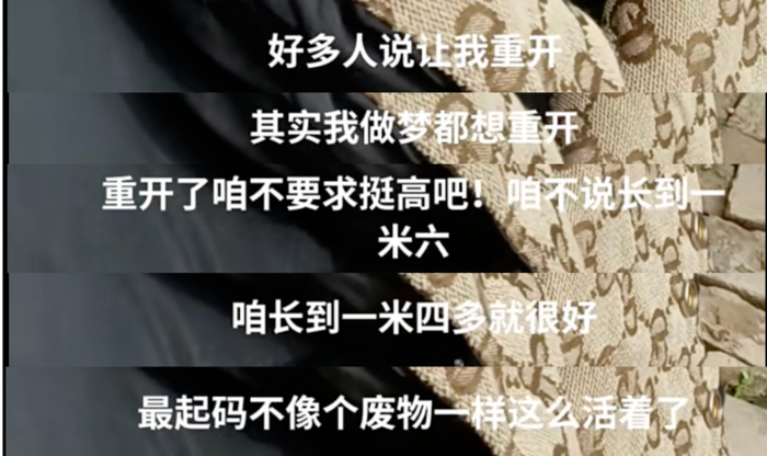 那些关于长高的想像,她寄托给了平行时空的自己:“重开的话,不说长到一米六,长到一米四就很好,起码不像个废物一样活着了。“