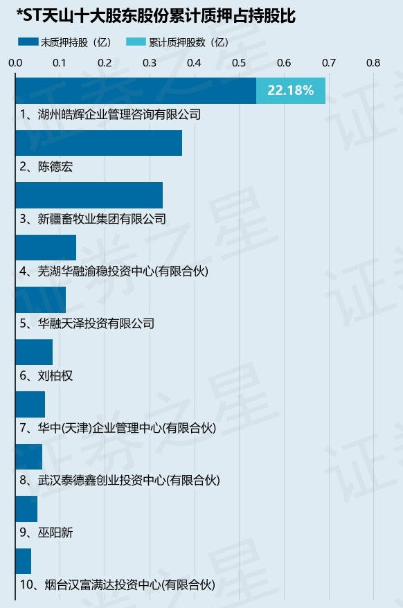 截止本公告日,股东湖州皓辉企业管理咨询有限公司已累计质押股份1535.0万股,占其持股总数的22.18%。本次质押后*ST天山十大股东的累计质押股份占持股比例见下图: