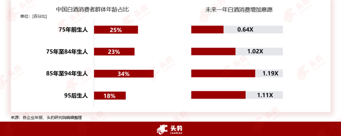 当下消费者不断年轻化,白酒行业中也不例外,白酒消费者也不断年轻化。尽管中国白酒消费者是存在典型的年龄圈层集中特点,但是当下的白酒消费者存在年轻化的趋势。中国白酒的主要消费人群年龄出现更替变化。当消费者的年龄不断增长,工作经验不断得到积累,85年至94年出生的人群开始成为社会的中流砥柱之后,随着该年龄段消费者不断成熟,白酒的主要消费群体也开始从85年前出生的人开始变成85年至94年出生的人。人群占比34%。在对未来一年白酒消费意愿调查中,85后消费者的白酒消费意愿普遍更强。当85后消费者的年龄不断增长之后,白酒消费需求和消费量会不断下降,白酒消费者群体将会偏转至95后的新一代消费者。