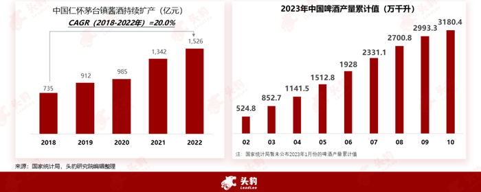 在股票市场,白酒行业的表现强势,啤酒行业存在一定风险。从产量上来看,中国白酒中酱酒产值持续攀升,从2018年的735亿元上涨至2022年的1,526亿元,年复合增长率为20%。酱酒延续扩容趋势,中长期盈利确定性强。这一趋势不仅反映了消费者对于高品质、口感独特的白酒产品的追求,也体现了酱酒企业在品牌建设、品质提升、市场拓展等方面的努力。首先,酱酒的扩容趋势源于其独特的口感和品质。酱酒以其浓郁的酱香、醇厚的口感、丰富的层次感而备受消费者青睐。在生产过程中,酱酒采用高温制曲、多次发酵、长期贮藏等独特工艺,使得其口感更加丰富、品质更加卓越。同时,酱酒在酿造过程中对于原料、水源、工艺等方面的严格要求,也进一步提升了其品质和口感。其次,随着消费者对于白酒品质和口感的追求不断提升,酱酒以其独特的风格和品味满足了消费者的需求。酱酒企业在品牌建设、品质提升、市场拓展等方面的努力,也进一步推动了酱酒市场的繁荣。许多酱酒企业注重产品研发、创新,不断提升产品的品质和口感,同时也加强了品牌营销和推广,提高了消费者对于酱酒品牌的认知度和忠诚度。