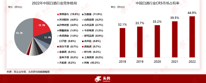 中国白酒行业的竞争集中度不断提升,行业CR5从2018年的32.1%上涨至目前的44.9%,实现五年间的持续增长。疫情爆发后,中国白酒部分企业利润承压,白酒行业因此加速分化,行业CR5在2020年至2021年出现较大的增长。但对比国外不同烈酒行业的集中度,中国白酒市场集中度有进一步提升的空间。2022年,我国白酒市场CR5为44.9%,韩国高达 91%,日本、美国以及全球平均CR5均在45%以上。未来中国白酒市场的集中度有望不断提升,市场分化程度不断加剧。