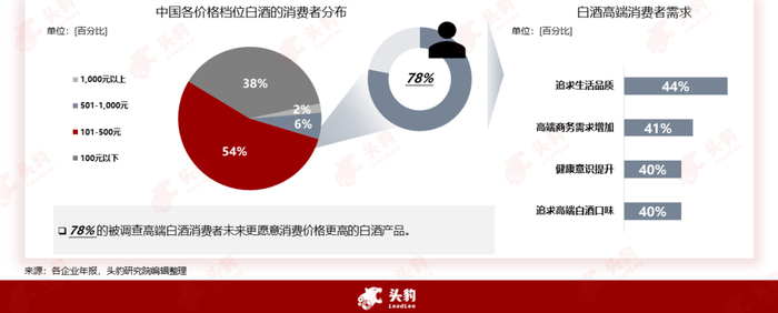 当下中国白酒产品结构和消费者结构呈现出明显的两极分化,追求高端白酒产品的消费者愿意支付更多的产品溢价购买好产品。从被调查消费者数据来看,尽管消费价格更高的白酒产品的消费者占比较低,但是其中78%的追求高端白酒产品消费者对白酒产品的高端化需求将不断增长。白酒行业高端化趋势的底层逻辑在于消费者收入提高,生活水平提升,消费者开始更关注健康、品质生活,这也促使白酒行业将真正回归重视于它的产品本质,“产品为先”将是白酒行业未来发展的主旋律。