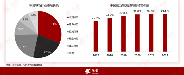 目前的中国啤酒市场形成了五大龙头公司割据市场的寡头竞争格局,市场集中度持续提高:中国啤酒行业经过多年发展与整合已进入成熟阶段,已形成以华润啤酒、青岛啤酒、百威英博、燕京啤酒、重庆啤酒五家龙头企业,众多区域性本土啤酒品牌瓜分剩余的市场份额,如珠江啤酒、兰州黄河等。前五啤酒品牌市场集中度自2017年的75.6%增长至2021年的92.9%,瓜分了中国啤酒行业的主要市场份额,竞争格局基本稳定,未来集中度仍存在提升空间但增速预计将较为平缓,同业整合并购事件相较以往将有所减少。
