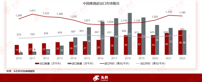 从啤酒行业的进出口市场来看,中国啤酒行业进出口数量级均价反映出中国啤酒品牌已开始优化产品结构,向中高端化转型来挖掘市场需求,提高品牌产品力和利润空间。在2010年至2018年期间,中国的啤酒进口量持续上升,主要集中在高端产品线。这期间,进口啤酒的平均价格远高于出口啤酒,反映出中国高端啤酒市场存在一定的供需缺口,部分需求需要依靠进口来满足。随着中国啤酒品牌加速高端化进程,积极开拓中高端市场,2018年至2021年期间,啤酒进口量逐年下降,复合年增长率为-13.9%。这表明行业高端化的趋势正在得到验证。