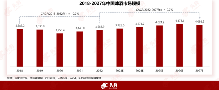 中国啤酒行业市场规模于2020年触底反弹,量价齐增,叠加消费升级赋能行业向更高端化发展,未来零售价格有望持续增加,预计2027年规模将达到随着人口老龄化趋势的加剧,以及白酒、葡萄酒等其他酒类产品对市场份额的挤占,中国啤酒行业的规模在2013年之后开始逐渐见顶,产销量双双下降,市场规模也呈现出不断萎缩的趋势。