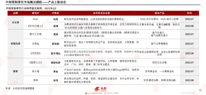 从品牌营销动态来看,茶饮品牌产品上新结合跨界联名、限量周边、主题门店,反响热烈。2023年第三季度热门IP类型包括动画、漫画、潮玩、游戏等。受众范围较广,更贴近消费者,实现流量带动销量。