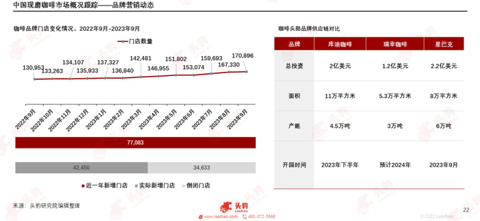 现磨咖啡品牌今年打响的价格战仍未结束,7月份库迪咖啡曾短暂提价,而后为配合大量新开门店的运营,开始新一轮价格战。库迪咖啡的美团团购券最低价格低至5.8元一杯,8.8元的团购券更是作为常规券发放,目前仍未看到价格战停止的苗头,预计本次价格战将长期延续。长久的价格战导致大量小品牌倒闭,根据窄门餐眼数据,截至9月13日,现磨咖啡赛道近一年来新开门店77,083家,净增长42,450家,意味着将近3.5万家咖啡品牌门店倒闭。头部品牌为降低成本以应对价格战开始卷向供应链,三季度星巴克产业园开园,库迪咖啡供应链基地预计下半年投入运营,瑞幸咖啡第二家烘焙基地也预计将于2024年投产。