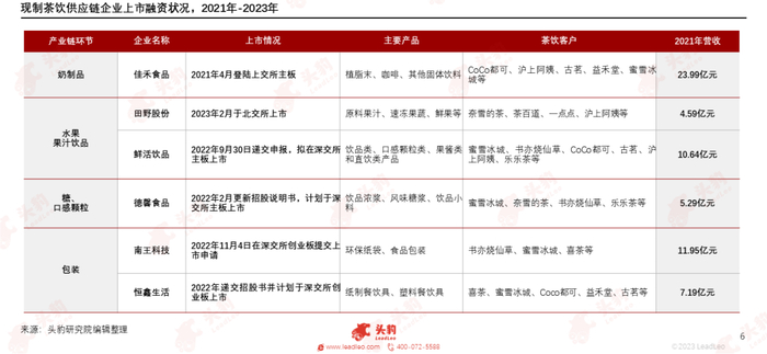 此外,供应商企业对核心客户存在一定依赖性。现制茶饮上游原材料市场相对分散、技术壁垒不高,相对于茶饮品牌方,原材料供应商议价能力弱。大部分供应链企业的前五大客户集中度高,具有客户稳定性风险,若未来主要客户流失,将会影响公司营收,这样的压力驱动供应商陆续登陆资本市场,提升抗风险能力。