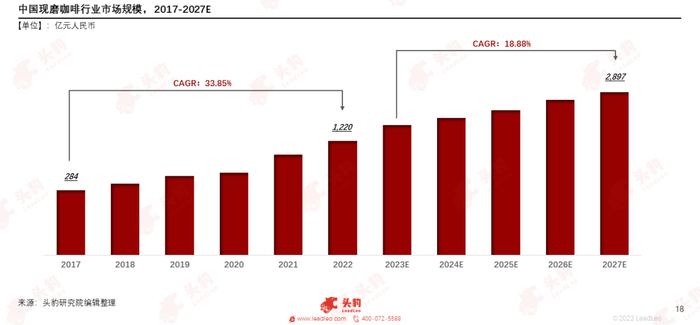 中国的现磨咖啡行业发展前景明朗,开发潜力较大。市场规模由2017年的284亿元增长到2022年的1,220亿元,年复合增长率达33.85%,市场呈现迅猛发展态势。随着人们消费观念的转变以及消费主体的更新,新中式咖啡解锁文化消费需求,加上互联网的宣传,现磨咖啡行业将有望进一步增长。预计2027年市场增长至2,897亿元,5年年复合增长率为18.88%。