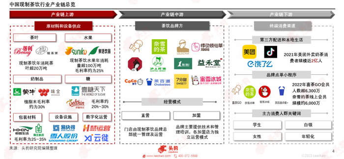 现制茶饮产业链路长,参与主体众多,目前已形成完整的产业生态体系。中国现制茶饮行业的产业链上游为茶叶、奶制品、水果、糖、包装材料等原材料供应商。中游环节为现制茶饮品牌方,经营模式包括直营模式和加盟模式。下游环节为茶饮门店、小程序和外卖等销售渠道,现制茶饮产品通过这些渠道流向终端消费者。