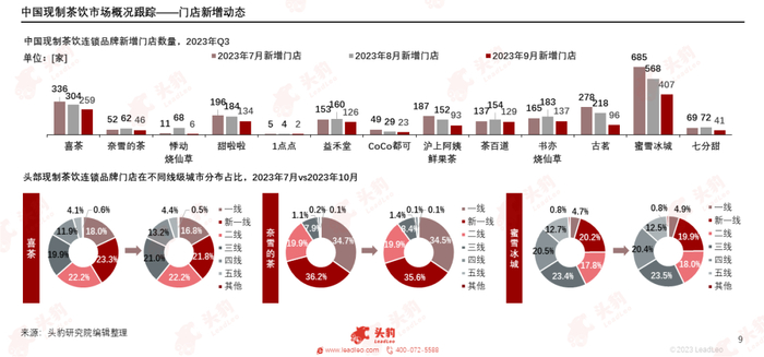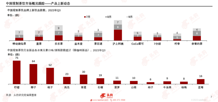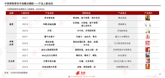 从产品上新动态来看,进入2023年第三季度,茶饮品牌创意方向以经典水果元素为主,结合秋季热点,主打差异化饮品。近50家现制茶饮头部品牌每月合计上新款数量,在剔除咖啡类新品后,分别为180款、155款和155款。新品创意方向以柠檬、椰子、桃子等经典元素为主,应用方向灵活,蓝莓、青提等新水果元素频繁上架。石榴、柿子等秋季水果热度上升,牛油果、榴莲等高价水果元素延伸至下沉市场。此外,进入秋冬季节,新品茶底特征突出,轻乳茶抢先上架,茉莉绿茶底最为经典,栀子绿茶关注度上升,茶饮品牌集中推广,奶茶新品数量大幅增加。