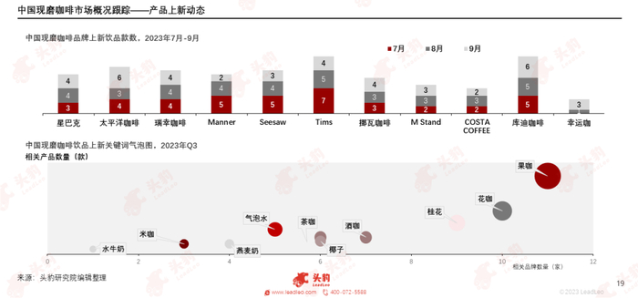 在统计的11家品牌共计120款产品中,所有品牌均上新果咖相关产品,总计60款新品,占比达到50%;有10家品牌上新花咖,总计33款新品,占比超25%。从数据上看,花果咖仍是不变的新品主流创新方向。2023年第三季度,米咖、酒咖、气泡咖啡成为各大品牌的创意开发地,其中有7家品牌上新了13款酒咖类产品,5家品牌上新了19款带气泡水的咖啡产品,如瑞幸咖啡的酱香拿铁、库迪咖啡的米乳拿铁、Manner的干姜美式等,这些新品凭借米、酒、气泡水新元素成为三季度的爆品。