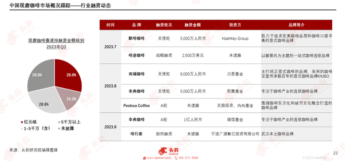 整体来看,在2023年第三季度现磨咖啡赛道投融资热度仍在延续,5起披露金额的投融资事件皆为千万元级别以上,亿元级别占比将近30%。资本对于早期项目更加青睐,天使轮的数量占比为42.9%,且投融资金额均在5,000万元以上。获投的新兴咖啡品牌主要布局咖啡的细分赛道,其中默啡咖啡和两瑞咖啡皆为主打意式咖啡的品牌,啡途咖啡和Peekoo Coffee则为特色咖啡品牌。