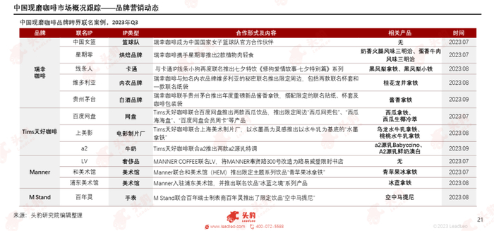 连锁现磨咖啡品牌的跨界联名成为营销、上新的常态化手段,相比于上半年每季度1-2次跨界联名的频率,三季度的联名频率进一步加快,头部品牌基本实现每月一次的跨界联名,其中瑞幸咖啡、Manner等品牌合计与超过5个品牌进行联名。从联名品牌看,三季度的联名品牌反差感极强,令消费者出其不意,如瑞幸咖啡与贵州茅台、瑞幸咖啡与维多利亚的秘密、Manner与LV、M Stand与百年灵等联名,其特征是联名品牌均为高端品牌,与走平价路线的咖啡品牌形成极大反差感,为消费者带来独特的体验和全新的元素感知,从而帮助咖啡品牌提升品牌形象,加强不同消费圈层之间的联系,弥补因价格战带来的品牌廉价感。