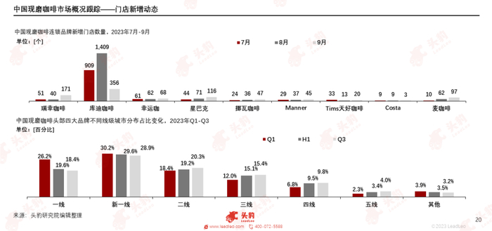 从头部四家咖啡品牌不同线级城市分布占比变化看,一线及新一线城市占比仍延续下降趋势,合计占比已减少至47.3%,同一季度相比减少约10%,二、三线及以下线级城市占比均呈不同幅度上升,合计占比为49.5%,预计四季度将超50%。从扩张数量看,二、三线城市成为咖啡品牌争夺的主战场,三季度四家品牌在二、三线城市新增门店1,568家,占比45.3%,定位于高端品牌的星巴克三季度有32.5%的新增门店开设在二、三线城市。多重数据表明现磨咖啡品牌对下沉市场的渗透仍未结束,且出现加速倾向。