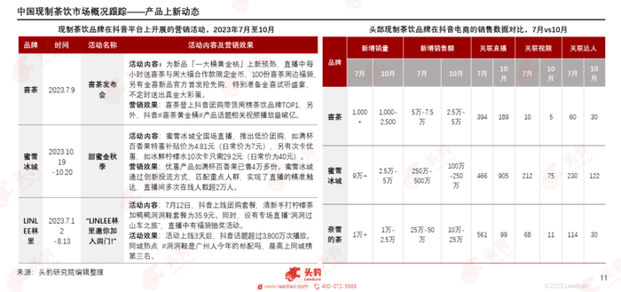 中国现制茶饮的竞争蔓延至抖音团购,并且围绕价格及内容方面展开。在价格方面,包括喜茶、蜜雪冰城在内的众多茶饮品牌,纷纷开启价格战,例如蜜雪冰城推出满杯百香果特惠价格低至4.81元的活动。在内容方面,喜茶为新品一大桶黄金桃准备符合主题的金喜试听盛宴直播,以新颖的直播方式为产品推广增加话题度。各品牌在抖音平台销售额随着关联直播、关联视频、关联达人的投入而变化。我们可以看到在7-10月期间,蜜雪冰城关联视频及达人数量减少,关联直播数量增加,相关活动处于预热阶段。另外,喜茶及奈雪的茶营销热度不减。