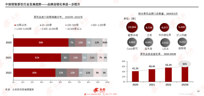 大型现制茶饮连锁品牌凭借着供应链优势、品牌效应和研发优势,发展势头良好。2020年至2022年,现制茶饮品牌连锁化率从41%上升至55%。从茶饮品类门店数规模分布来看,10家以内的门店规模的茶饮品牌数量占比显著下降,5,000-1,0000家及万店规模的茶饮门店数占比有所增长。这是由于大型连锁品牌具有供应链优势、品牌效应和研发优势,从而实现规模化发展。