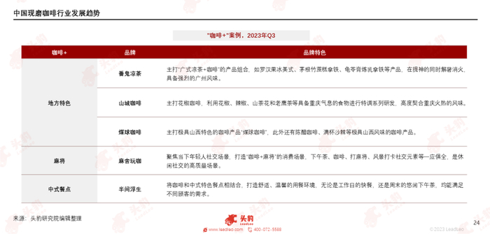头部品牌“咖啡+”打法较为固定,多以跨界联名形式进行,与其余品牌共同推出新品,如“瑞幸咖啡+贵州茅台”、“库迪咖啡+五常大米”等组合。对于新兴品牌而言,跨界联名的形式成本过高,且难以促成合作,因此通过“咖啡+食品”打造新消费组合与“咖啡+场景”打造新消费场景成为新品牌差异化打法,如“咖啡+简餐”打造早餐组合,“咖啡+中药”打造地方特色咖啡,“咖啡+麻将馆”、“咖啡+书店”打造新的消费场景等。