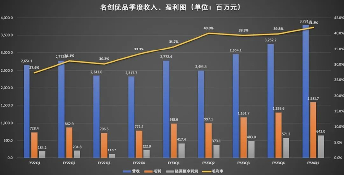 数据显示,截至第一财季末,名创优品总营收达37.9亿元,同比增长37%,再次刷新单季度纪录,毛利率也首次突破40%,达到41.8%,较去年同期上升6.1个百分点;调整后净利润为6.4亿元,同比增长54%;经调整净利润率为16.9%。