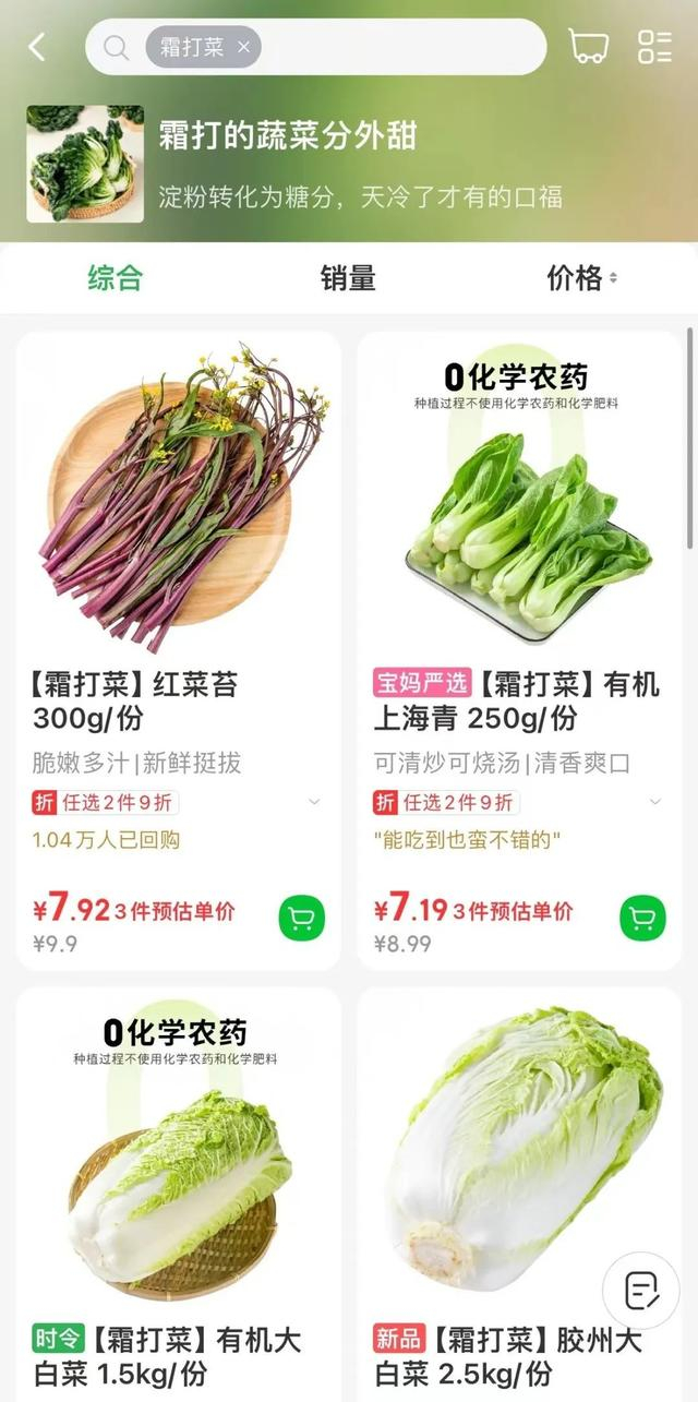 “霜打的蔬菜分外甜”,打开“叮咚买菜”软件搜索“霜打菜”,从松花菜、高原菜心苗、趴地笨菠菜、紫甘蓝到矮脚黄、菜苔、红菜苔、塔菜、黄心乌......大家可以看到近百种产自全国各个地区的霜打菜系列商品。
