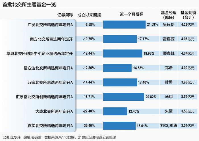 数据显示,截至11月22日,首批北交所主题基金成立满2周年,成立以来的回报率在-6.58%至-36.40%之间。