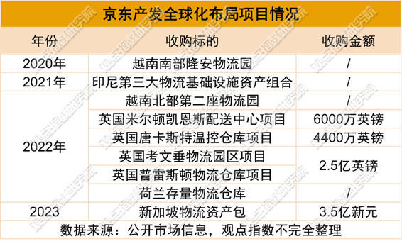 京东产发在2020年公布全球化布局后,据观点指数统计近三年其已先后收购了位于越南、印尼、英国、荷兰等国家的多处物流仓储项目,其中英国的收购项目数量最多。