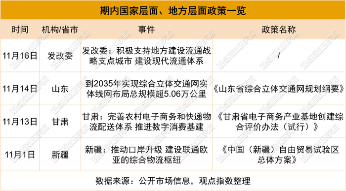 报告期内,共录得4起国家与地方层面相关政策的颁布,可以发现政策主要是从构建物流流通体系、建设综合物流枢纽着手促进。