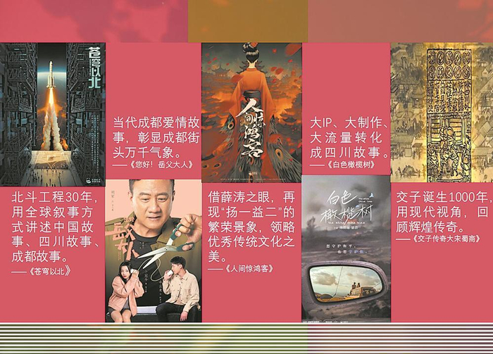围绕“四川题材成都故事”,成都文旅集团从都市生活、大国重器、文化传承、历史传奇、网文改编等5个维度精心组织创作生产,以“5朵金花”策略重点推出影视剧《你好!岳父大人》《苍穹以北》《人间惊鸿客(薛涛)》《交子传奇大宋蜀商》和《白色橄榄树》。