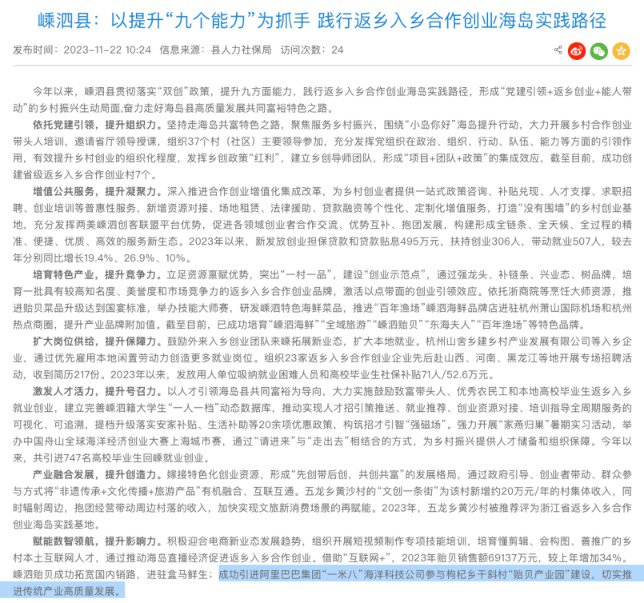 而上述“一米八”海洋科技公司已在水产养殖领域有所作为。浙江嵊泗县人民政府官网11月22日的消息显示,该县已成功引进阿里巴巴集团“一米八”海洋科技公司参与枸杞乡干斜村“贻贝产业园”建设。