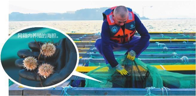 不远处的海面上,漂浮着成片的彩色浮筏球,蔚为壮观。与网箱约1.5米深不同,每个浮筏球下面都有一个5至十余米不等的吊笼,分层挂养着海胆、扇贝等种苗。岸上,随处可见满载而归的渔船,将扇贝、牡蛎、海胆等送进加工车间,经清洗加工包装后发往全国各地。