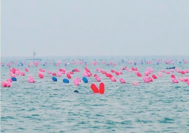 在长海县的海面上漂浮着用于分层挂养的成片彩色浮筏球,蔚为壮观。