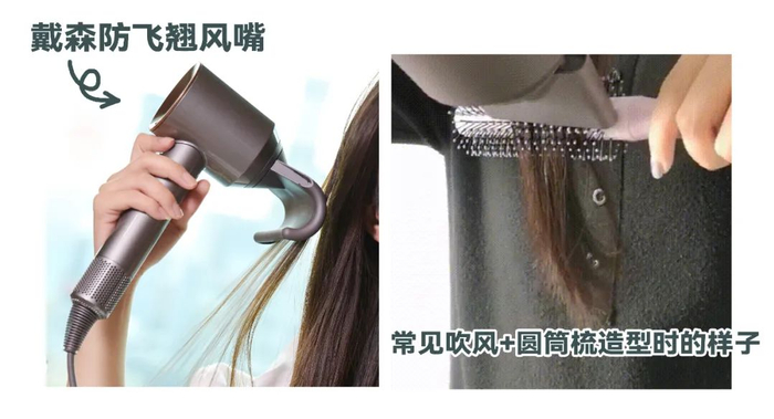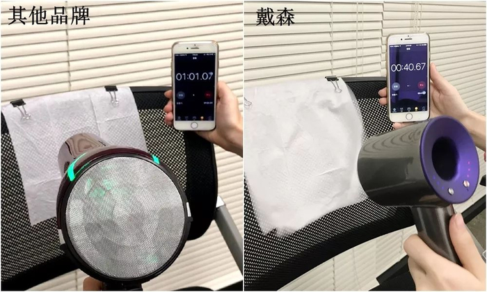 为了检验戴森吹风机的速干能力,我们用普通速干吹风机进行风力对比。
