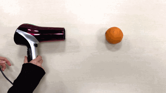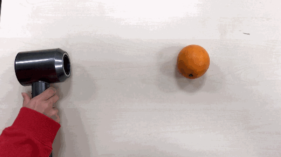 结果非常明显:普通速干吹风机风力很小,风力完全带不动橙子!而我们的戴森吹风机唰一下“吹飞”橙子!