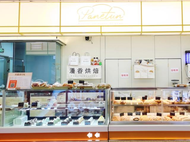 于11月上旬开业的Panetun潘吞烘焙,推出了“全场面包买三送一”“充值享好礼”等活动。小店位于商场一层,暖黄色的店招和简洁的店面,成了一道靓丽的风景线。可以看到,门店大部分空间为后厨区域,软欧面包、蛋糕等被摆放在橱柜中,过往市民可直接选购,即买即走。