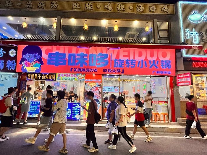 比如位于广州客村地铁站周边的“串味哆旋转小火锅”,傍晚7时许店内已基本坐满,门口也有不少年轻消费者排队,同一条街相隔约50米的“艾氏旋转小火锅”门店也排起了长队。