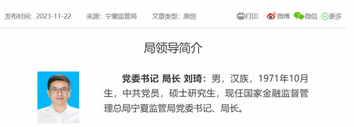 刘琦,国家金融监督管理局宁夏党委书记、局长,此前担任国家金融监督管理总局上海监管局党委委员、副局长。