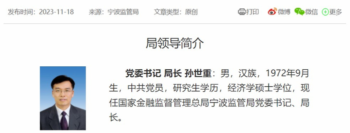 孙世重, 国家金融监督管理总局宁波监管局党委书记、局长。公开简历显示,孙世重1972年9月出生,曾于2016年4月任山西银监局党委委员、纪委书记,2019年4月任天津银保监局党委委员、纪委书记,2022年8月任山东银保监局党委委员、副局长。